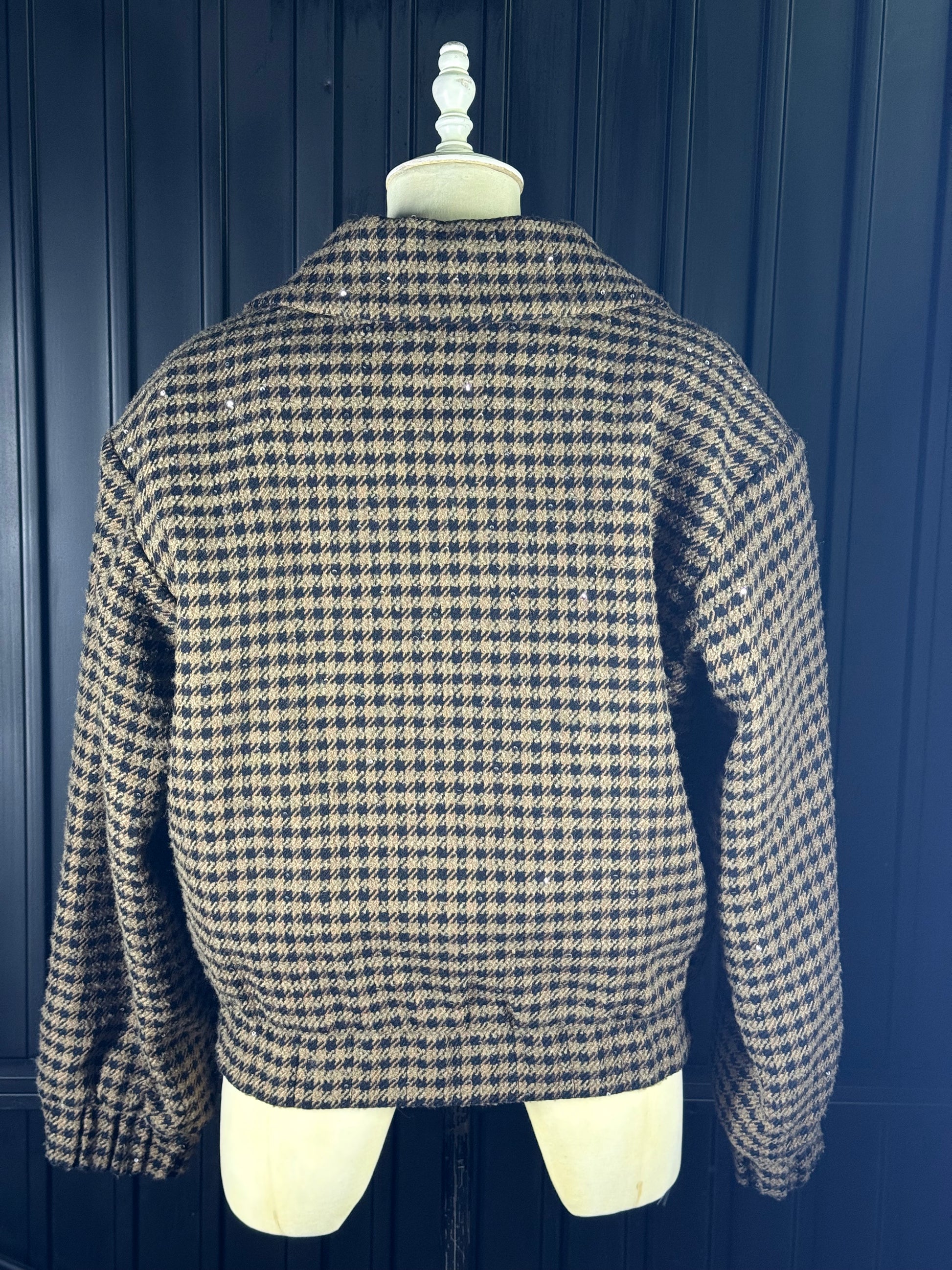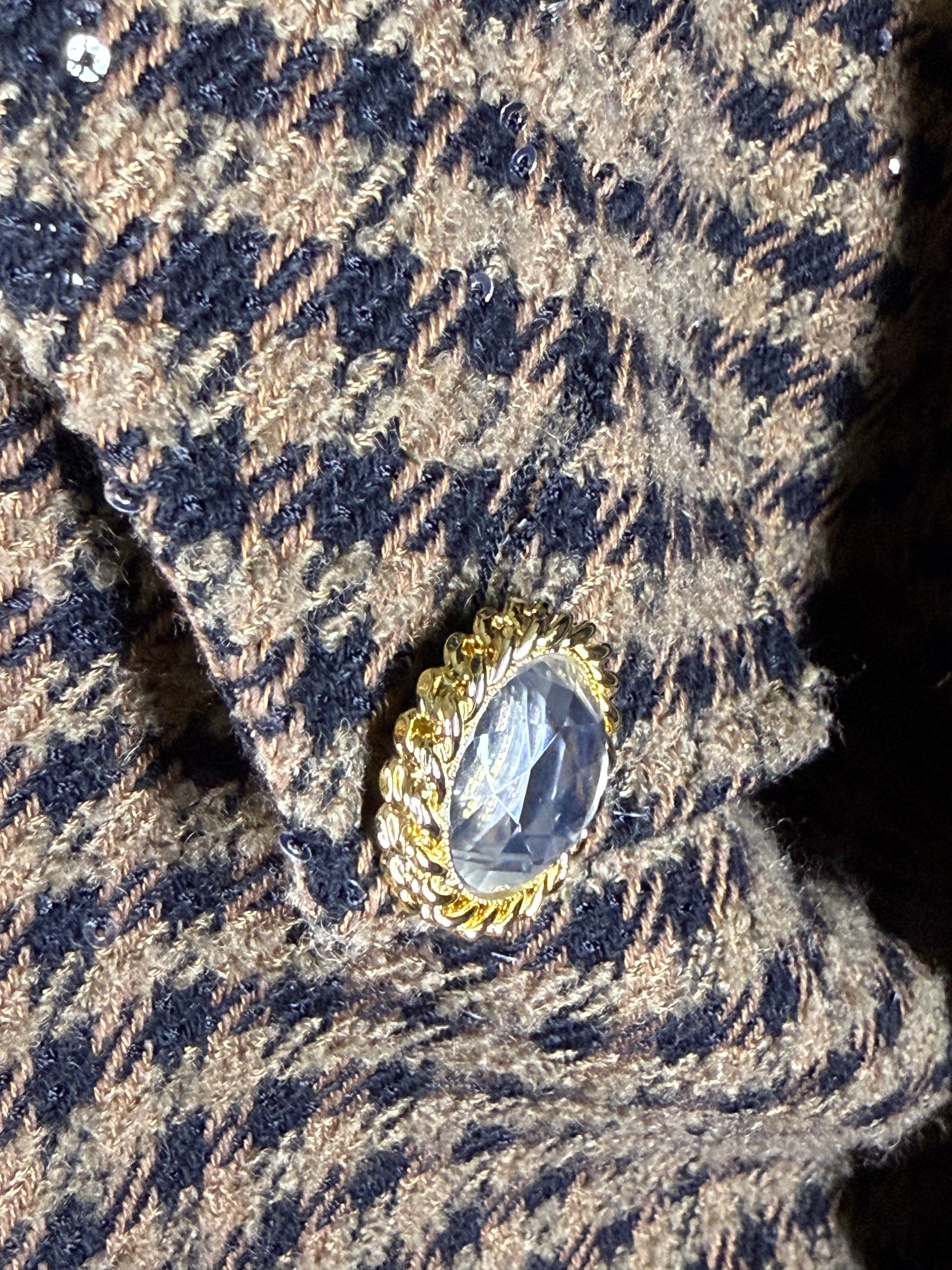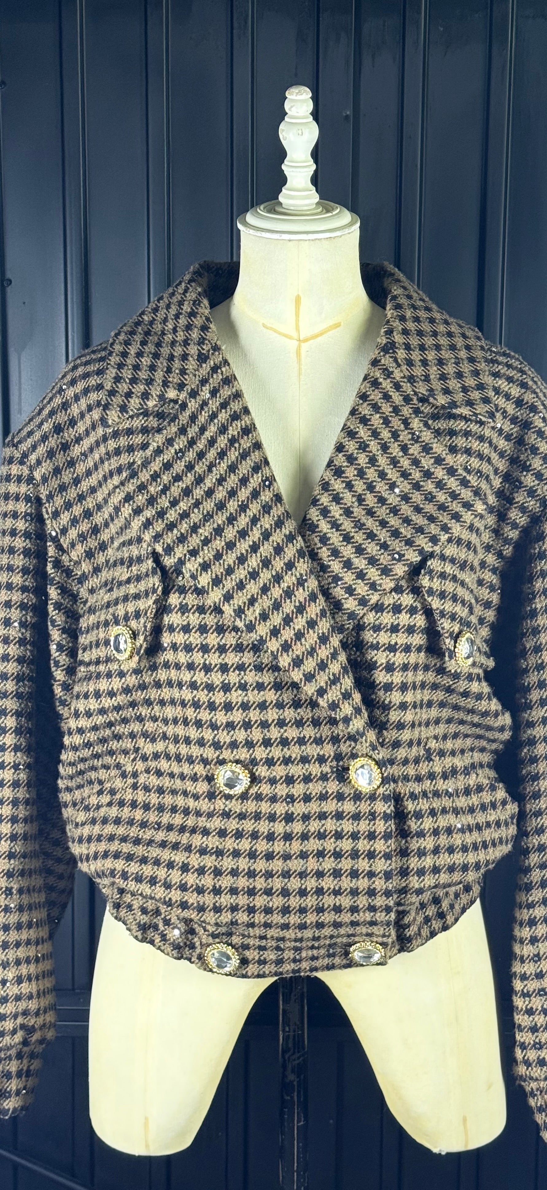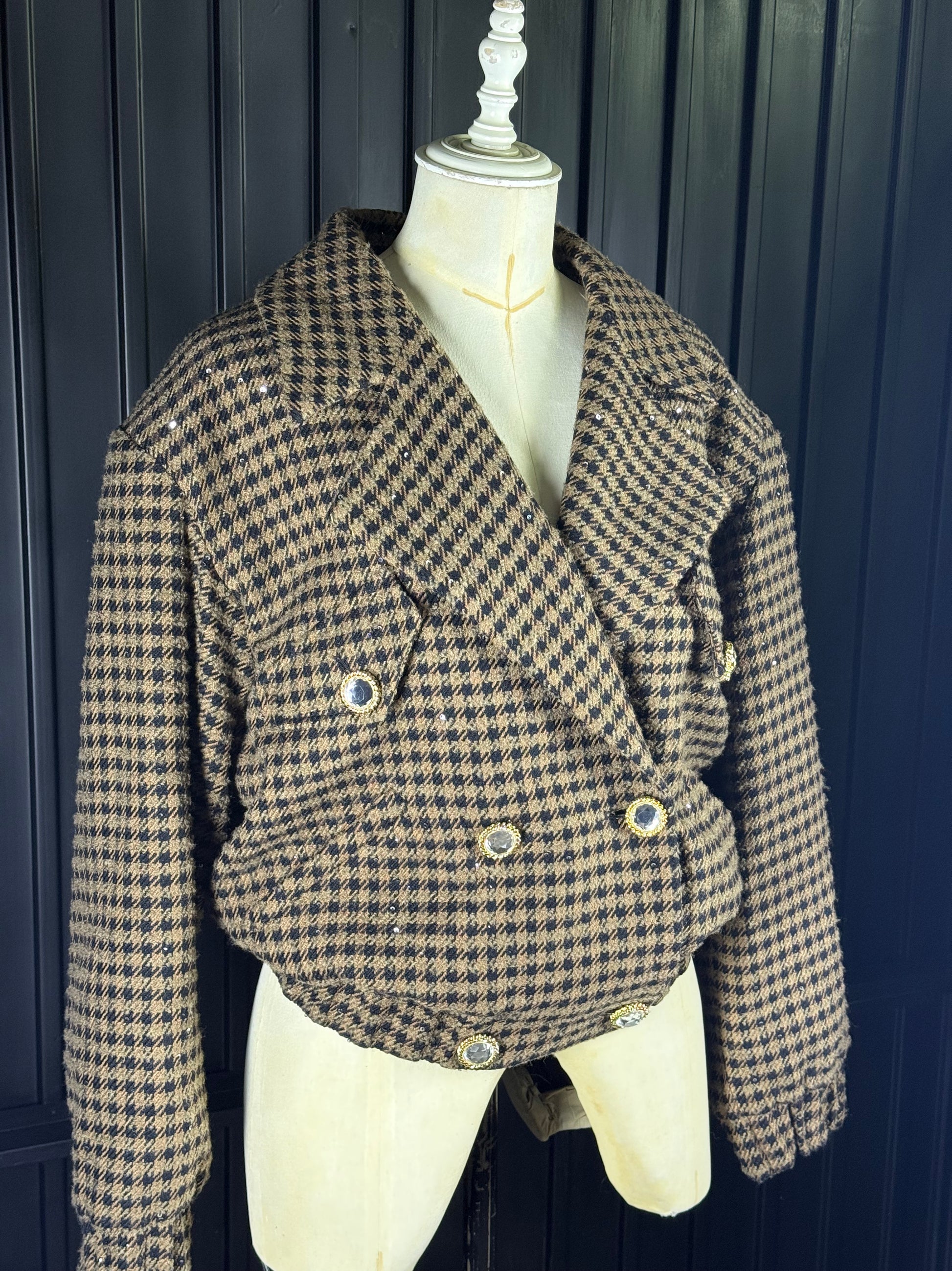 - Beautifully cut double-breasted oversized bomber in a luxurious brown & black tweed subtly embellished all over with small black sequins and feature crystal buttons