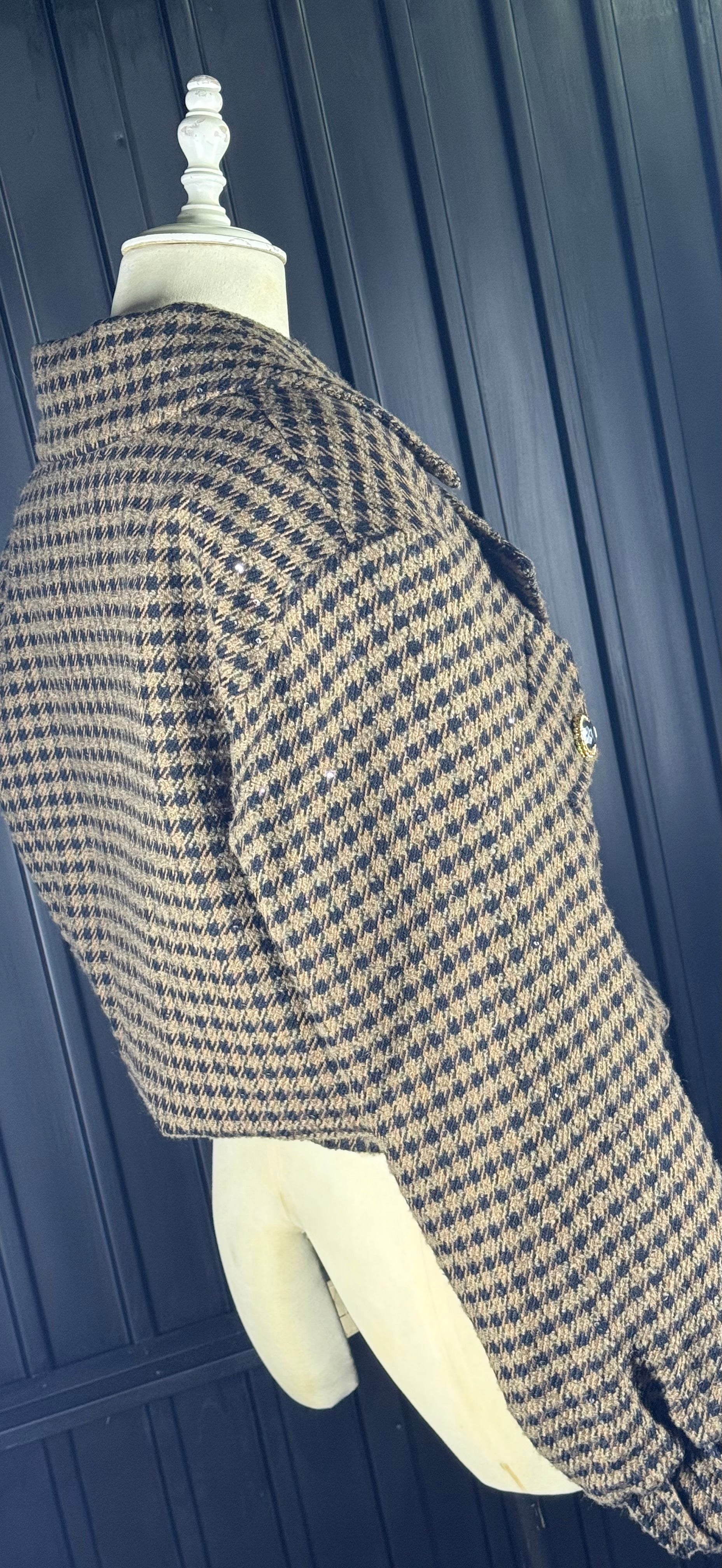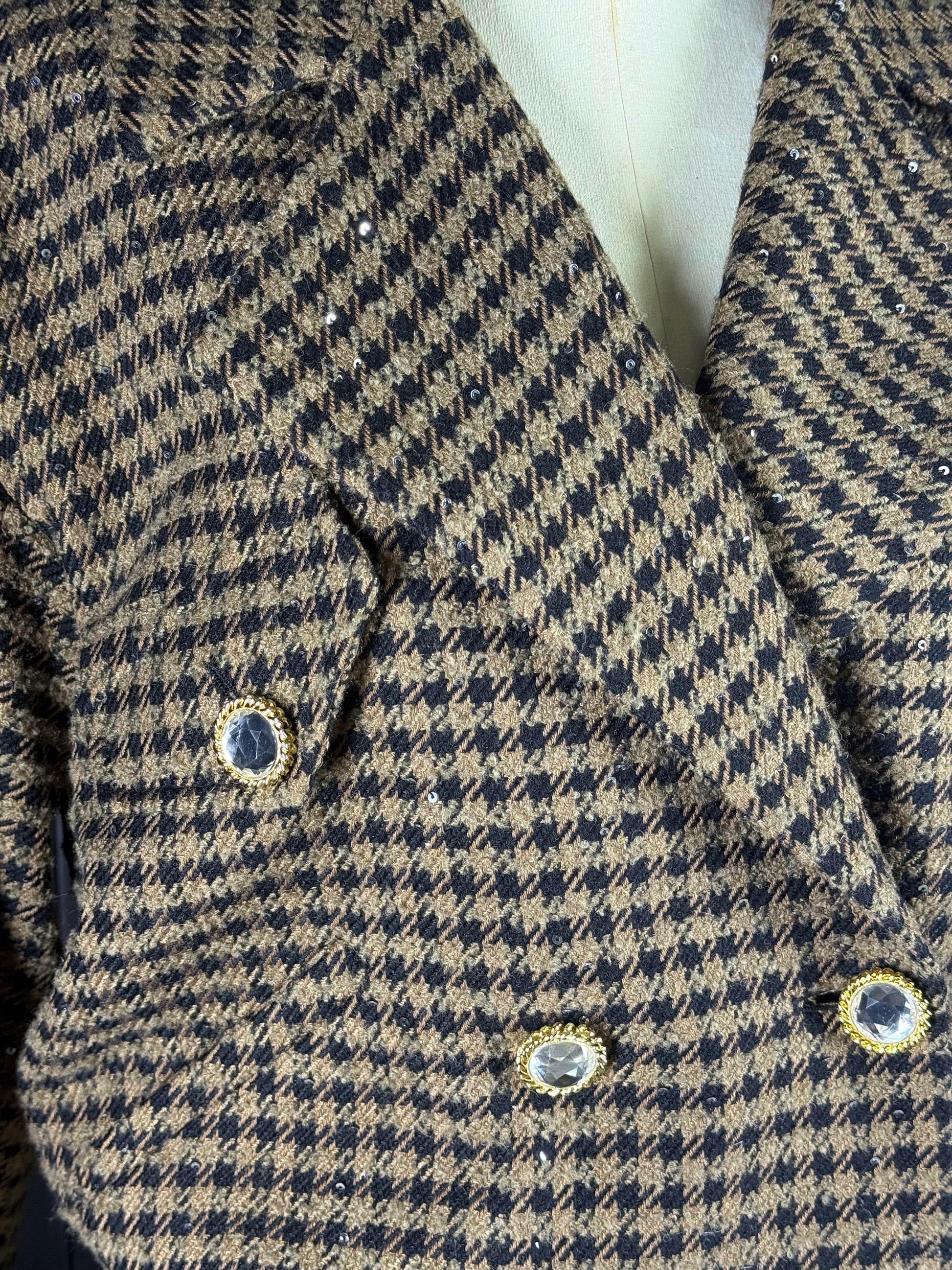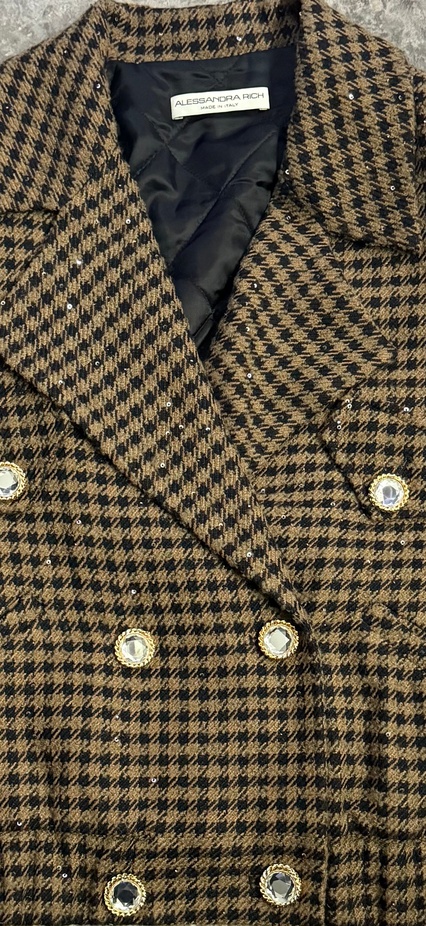 - Beautifully cut double-breasted oversized bomber in a luxurious brown & black tweed subtly embellished all over with small black sequins and feature crystal buttons