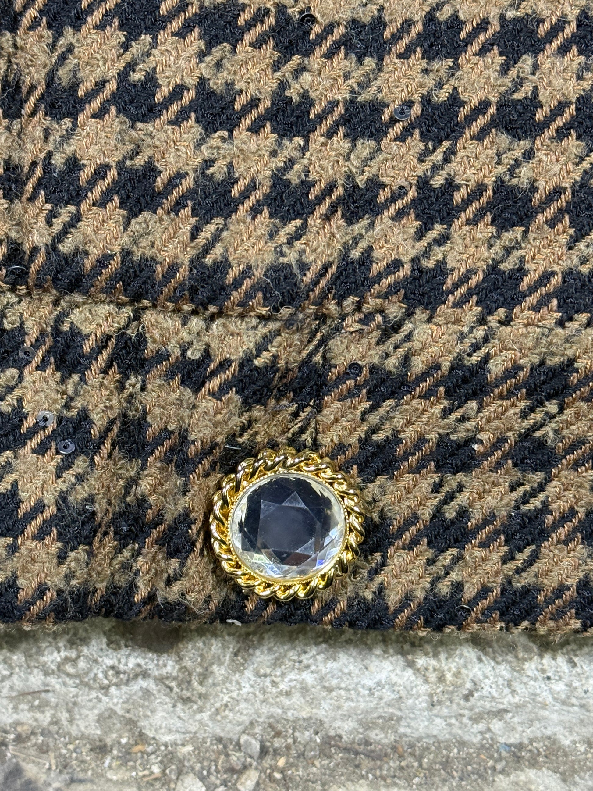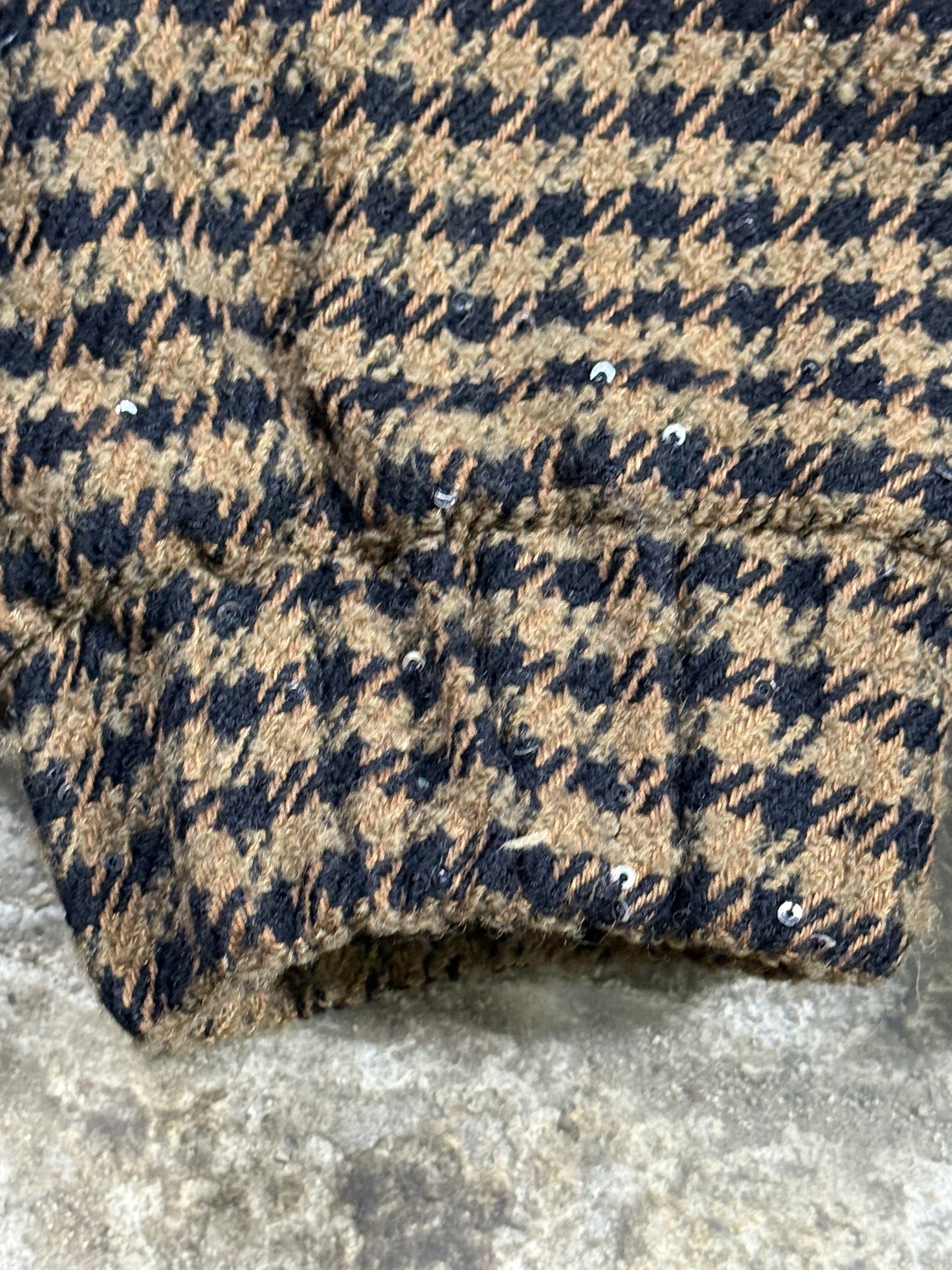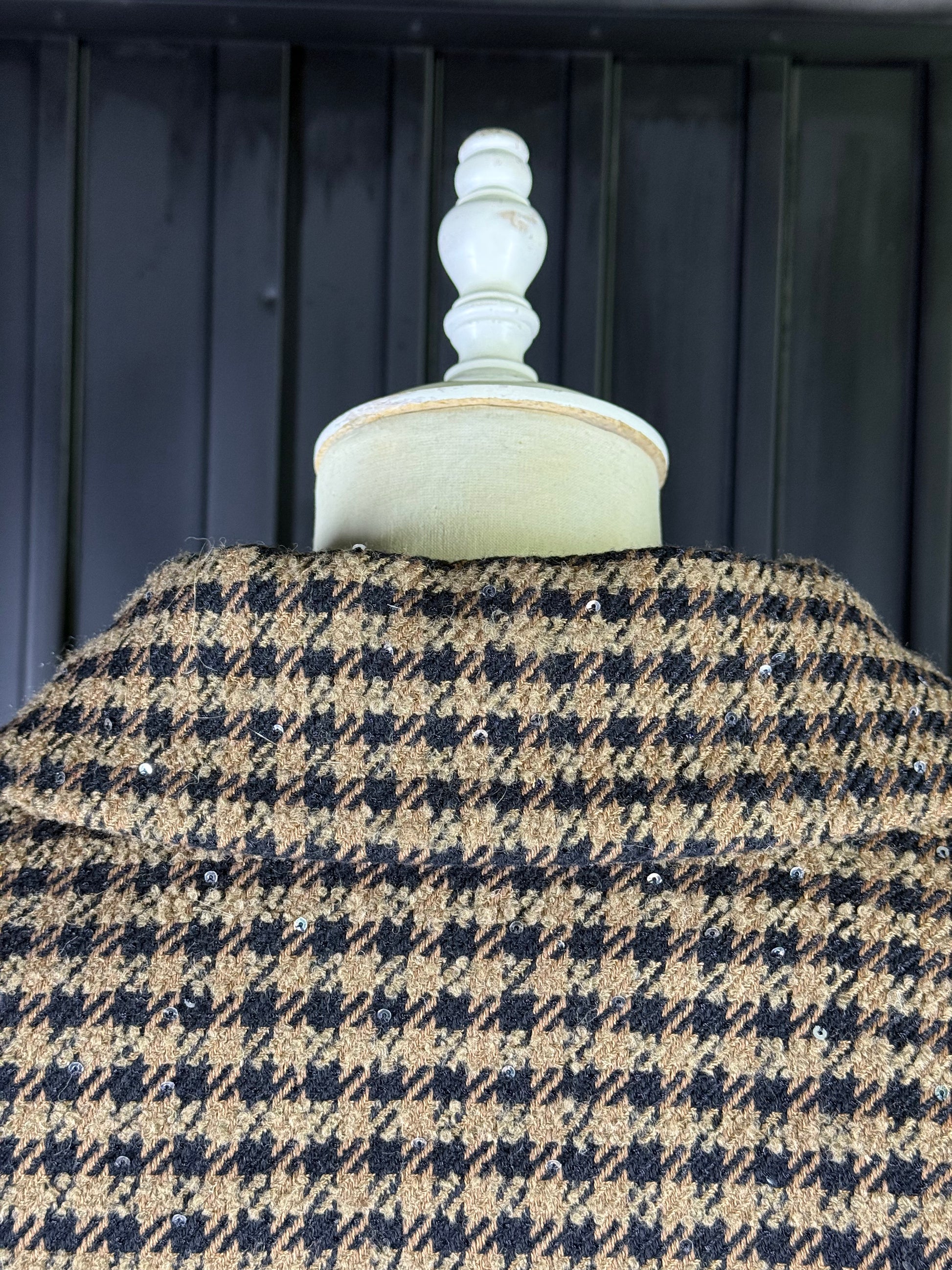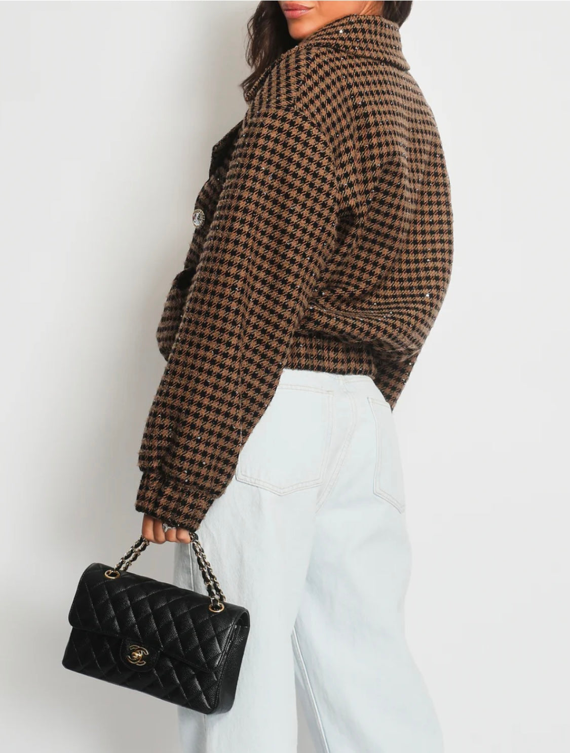 - Beautifully cut double-breasted oversized bomber in a luxurious brown & black tweed subtly embellished all over with small black sequins and feature crystal buttons